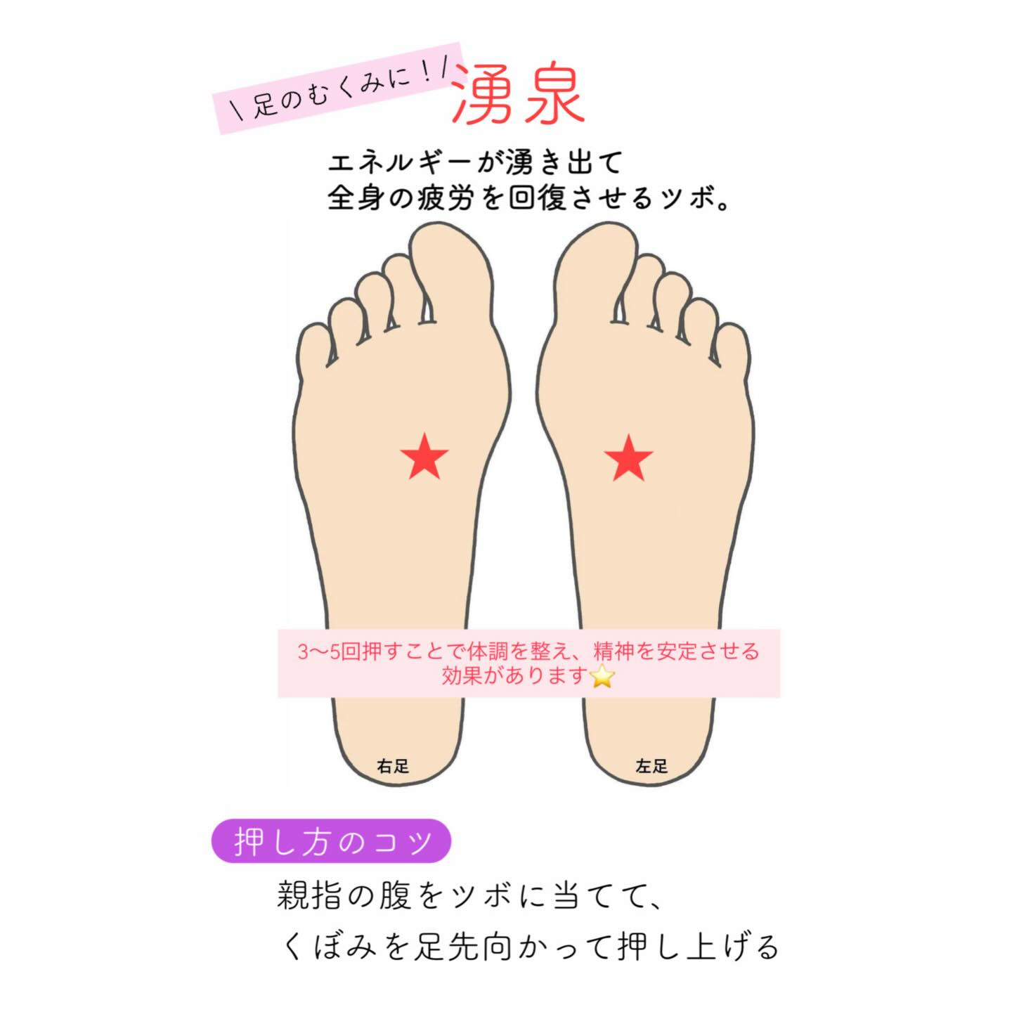 皮下に溜まった余分な水分をすっきりさせるので、むくみが気になる方は湧泉を押してみてください♩
