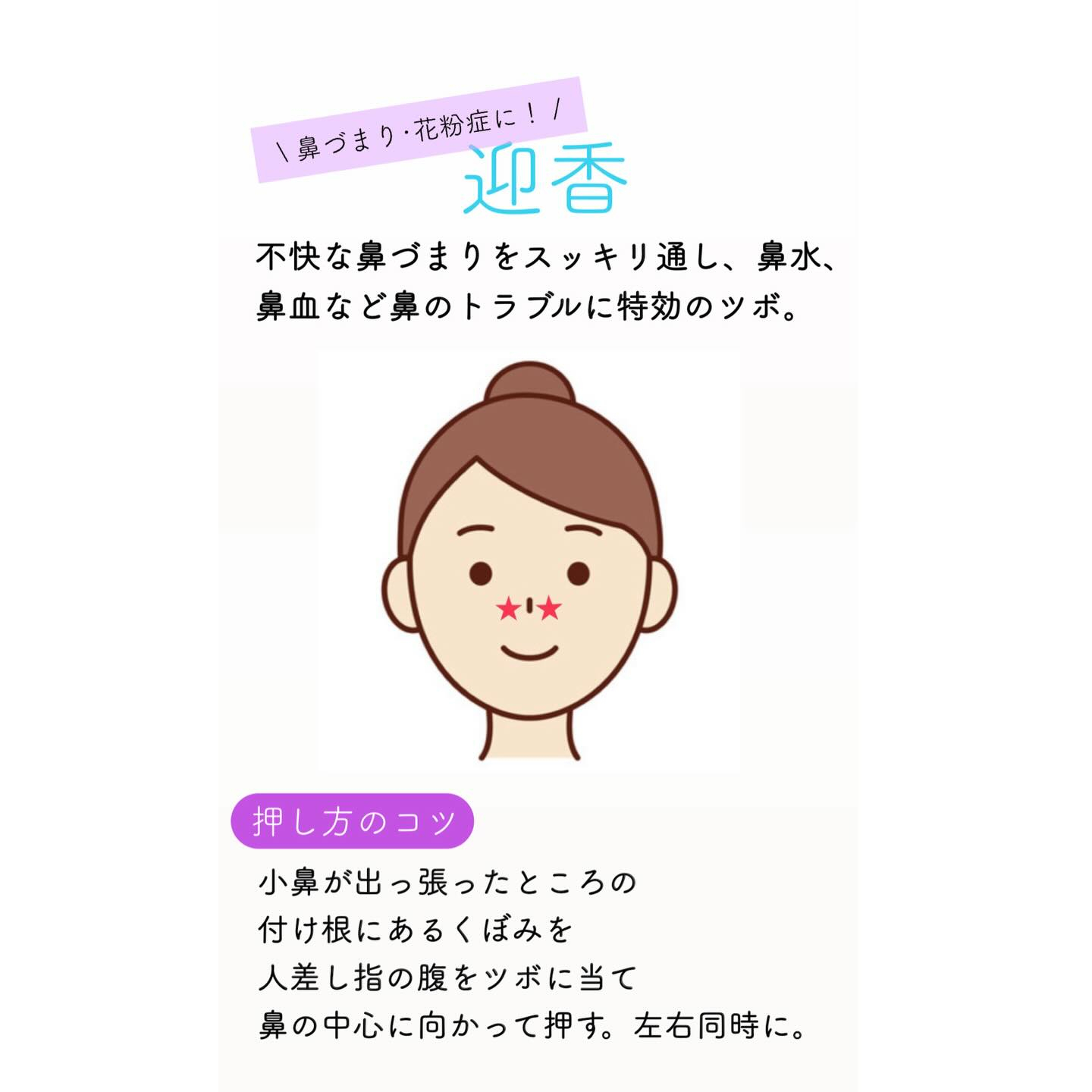 人差し指の腹をツボに当て鼻の中心に向かって、5秒間左右同時に押してみてください♩
